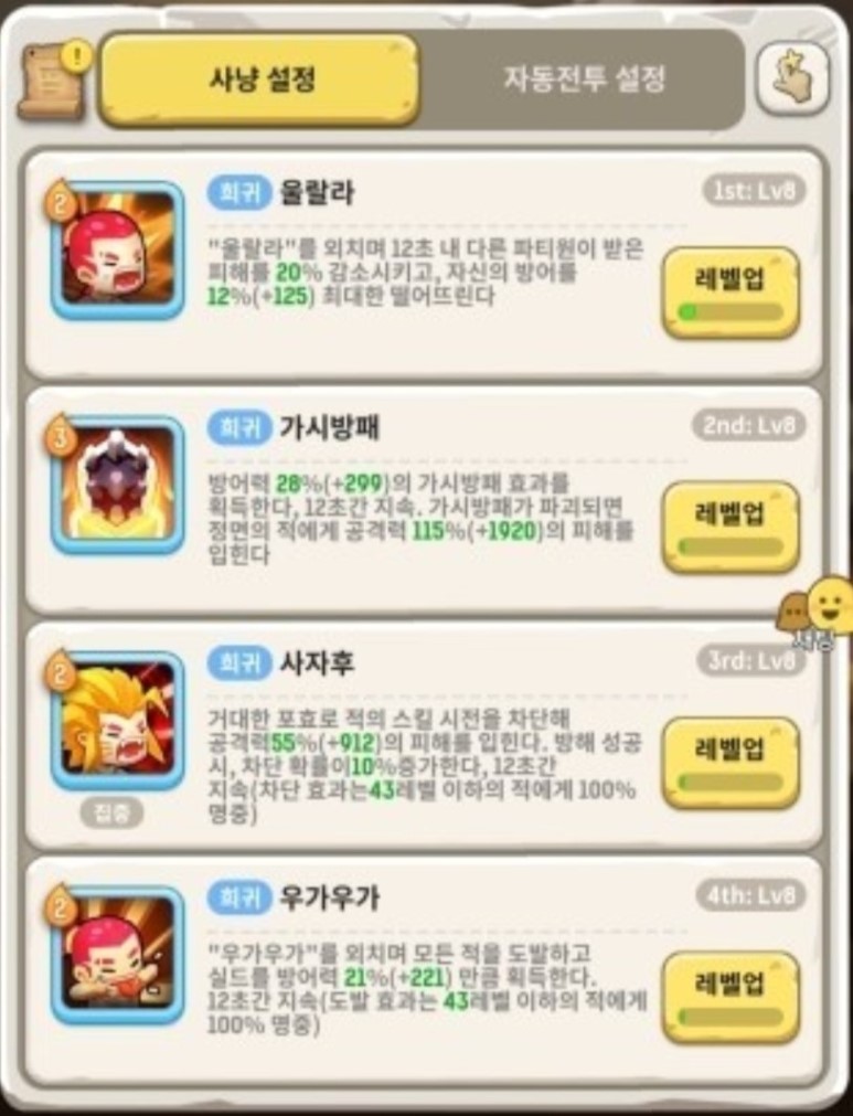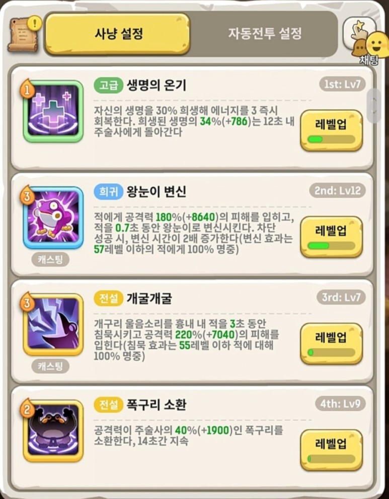 2일째 하면서 느낀건데 일단 방치지만 나중에 강해지기 위해서 스킬을 많이 알아야겠더라구요.