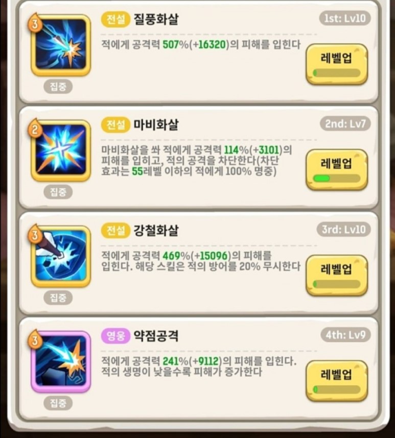 냥꾼은 활을 드니까 치명타가 중요하고 한방에 큰 데미지를 주는데 집중하는것 같습니다.